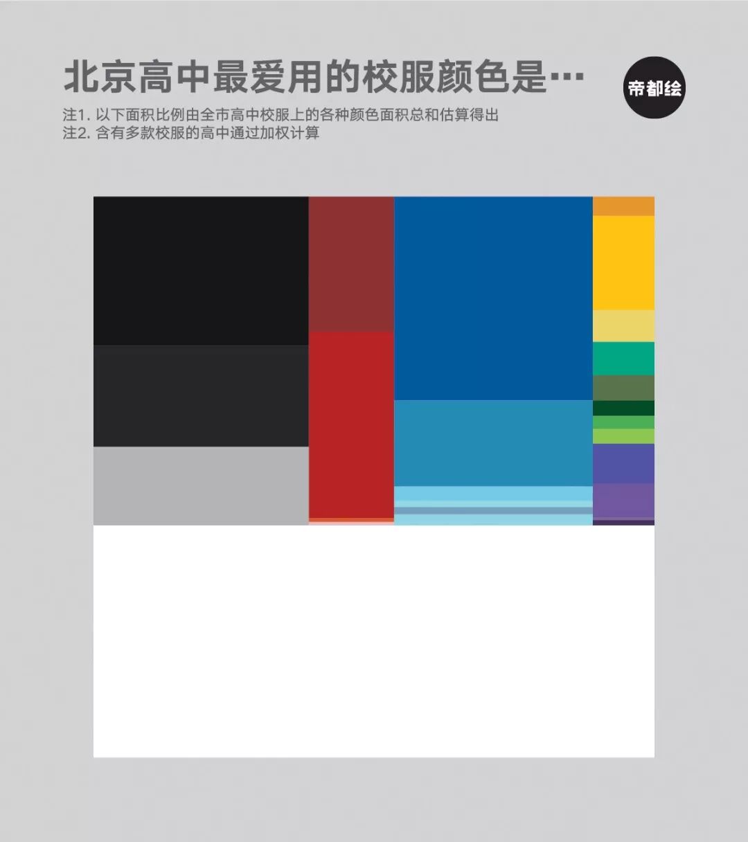 当然是白色!看来“白衣飘飘的年代”放在高中依然适用。在白色之外,蓝色、黑色和红色分列北京高中校服颜色使用榜的第2、3、4位。灰、黄、绿、紫等颜色出现得就更少了。棕色的缺席让人有些意外。