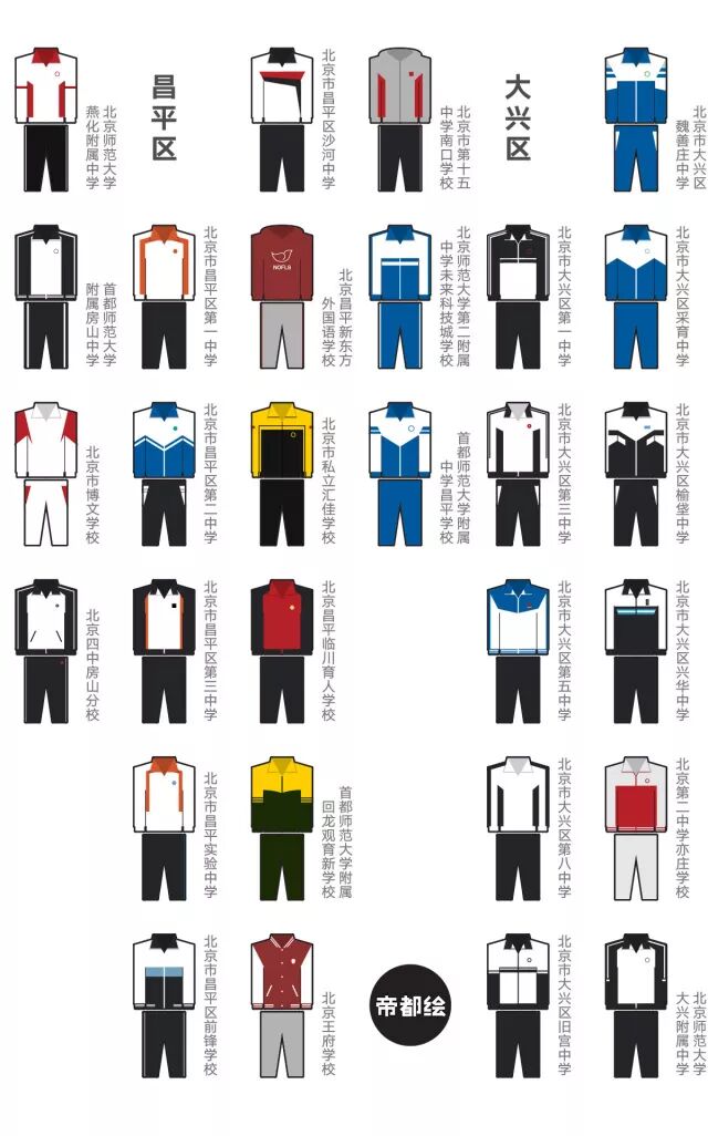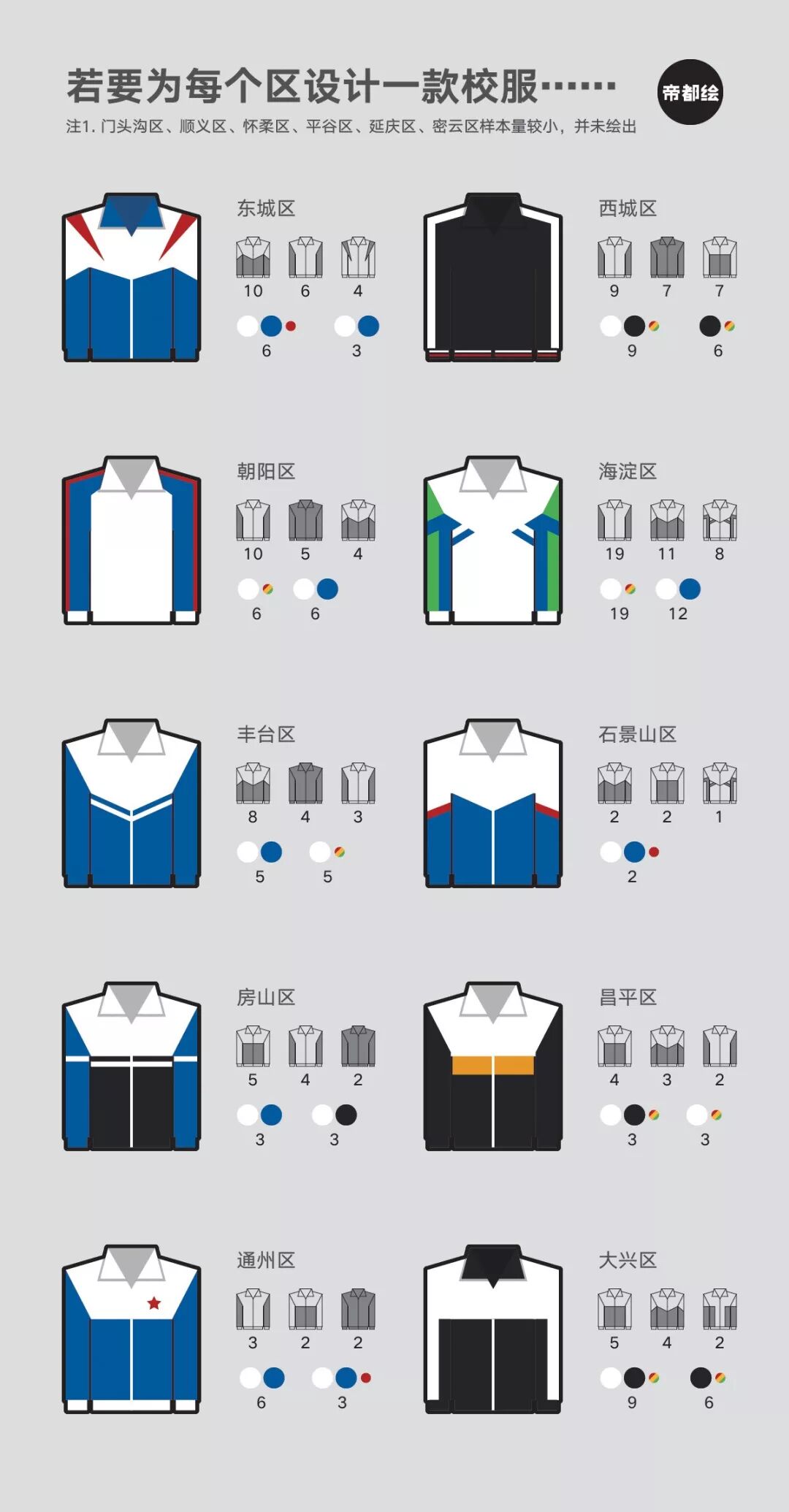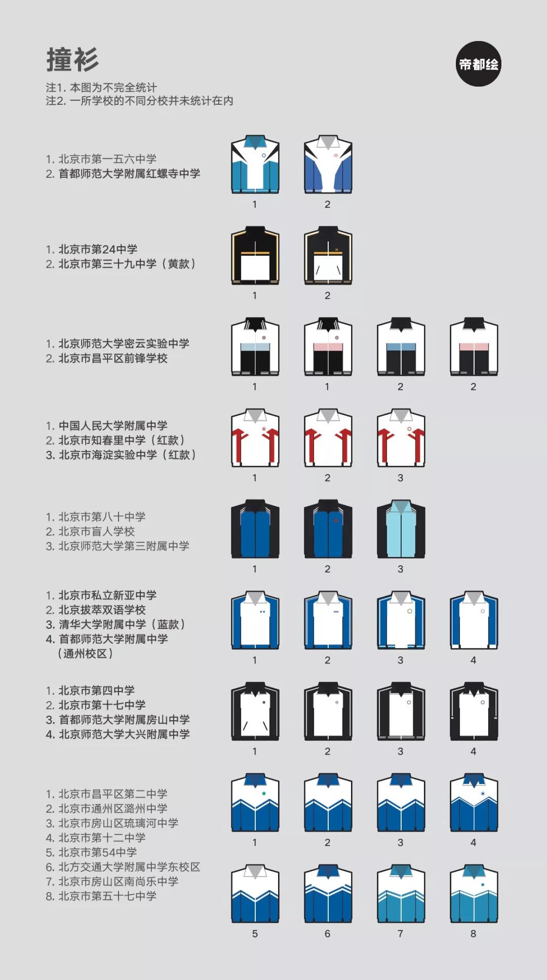 由于近年来北京的中学加速合并,这里选用的是 2015年 全市的 高中 名单。当年,北京共有高中286所,因资料所限,我们绘制的高中有264所,选择的款式为 秋冬季的长袖运动服 。因为很多学校有不止一款秋冬季长袖运动服,这些款式被分别绘出(共332款),但在上图中只选择了其中一款作为这所学校的代表。