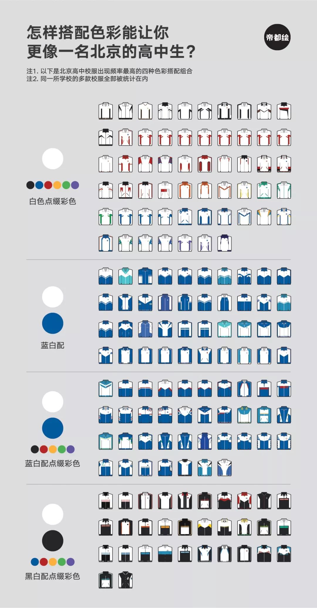 对很多人来说,可能就是中学校服的颜色。你穿着它度过了人生中精力最旺盛的几年,你身边的其他几百个同学也是如此,甚至还包括你曾暗恋的那个小姑娘/小男孩——你们可是穿了好多年的情侣装啊。一般情况下,你的校服都不会很好看,不过每当看见隔壁学校的校服时,你也就心理平衡了。而这一次,我们一共看了全北京高中的三百多套校服……
